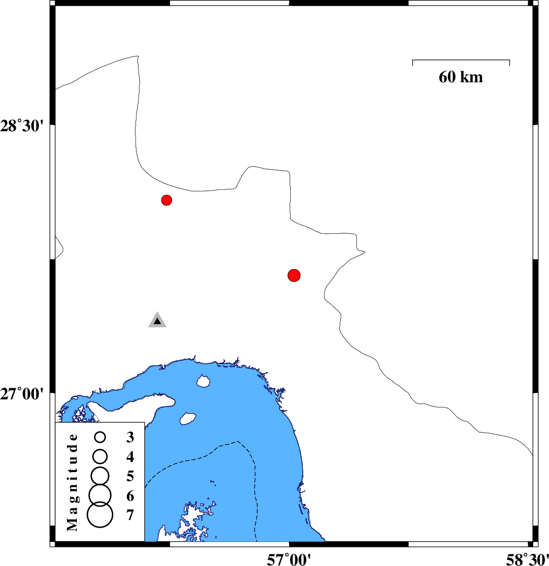 2008/08/03 | 00:44:38.4 | 05:14:38.4 | 27.66 | 57.03 | 15 | ML3.5 | 33 km North-West of Dehbarez, Hormozgan Province | ||