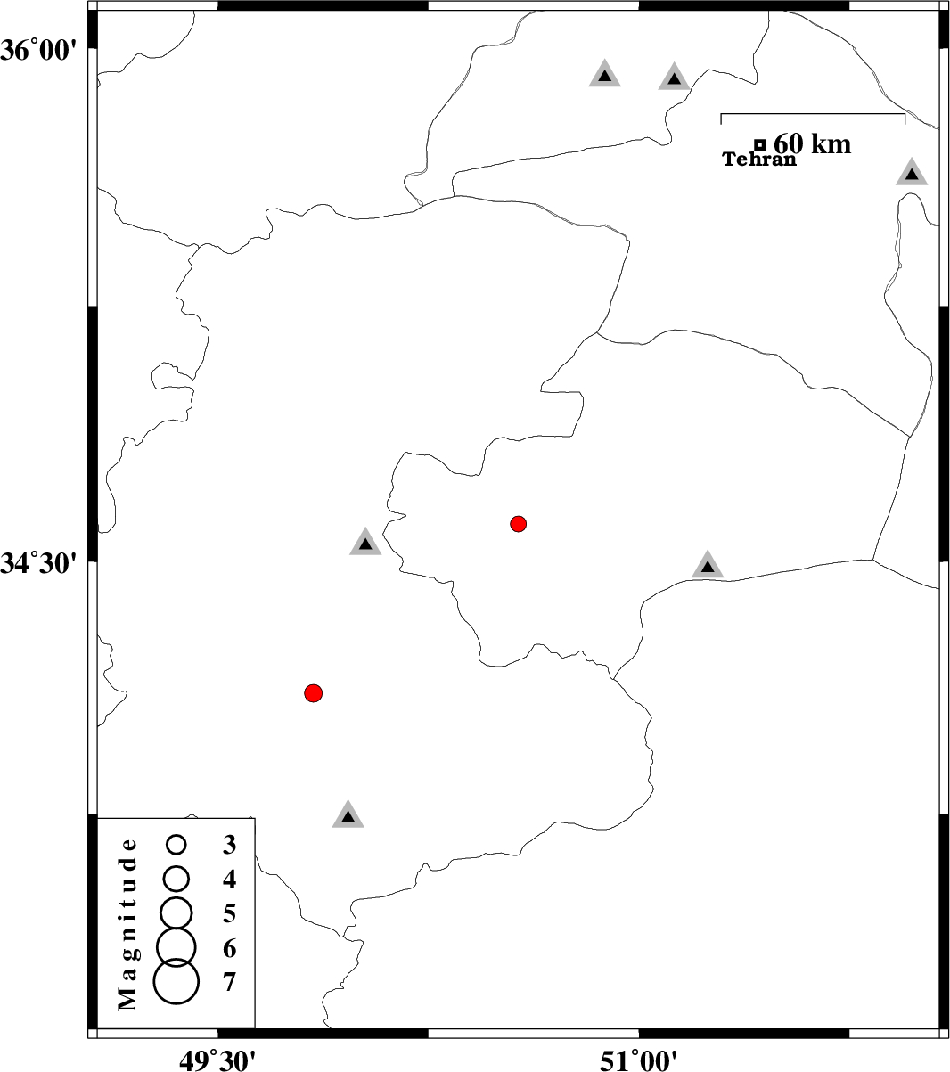 | 2008/07/18 | 04:37:19.4 | 09:07:19.4 | 34.11 | 49.84 | 14 | ML2.8 | 14 km East of Arak, Markazi Province |
