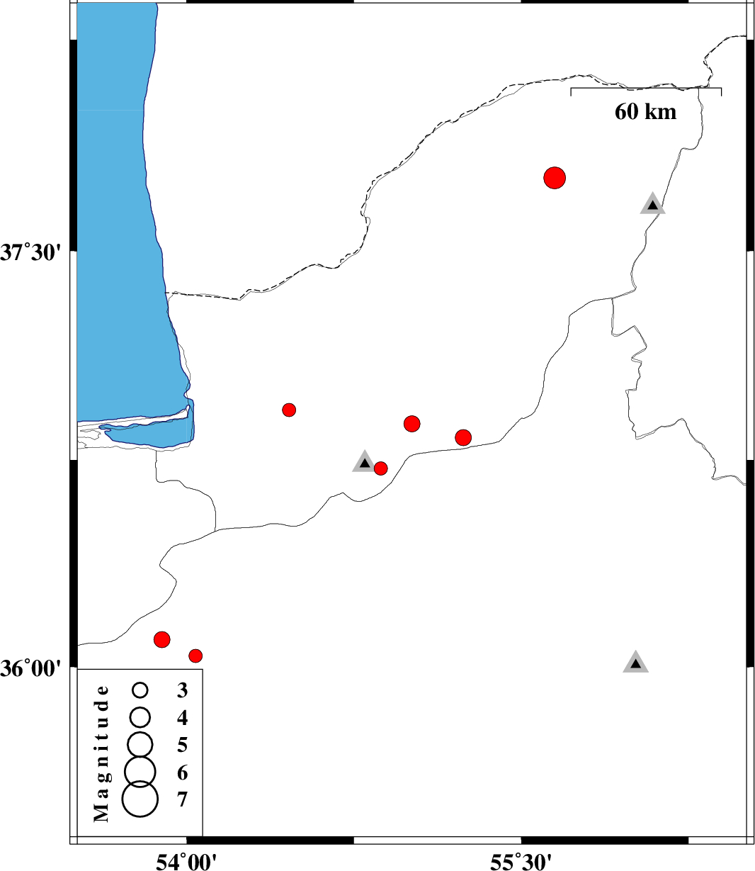 2008/08/10 | 00:29:49.6 | 04:59:49.6 | 36.83 | 55.24 | 15 | ML3.3 | 21 km South of Ramian, Golestan Province | ||