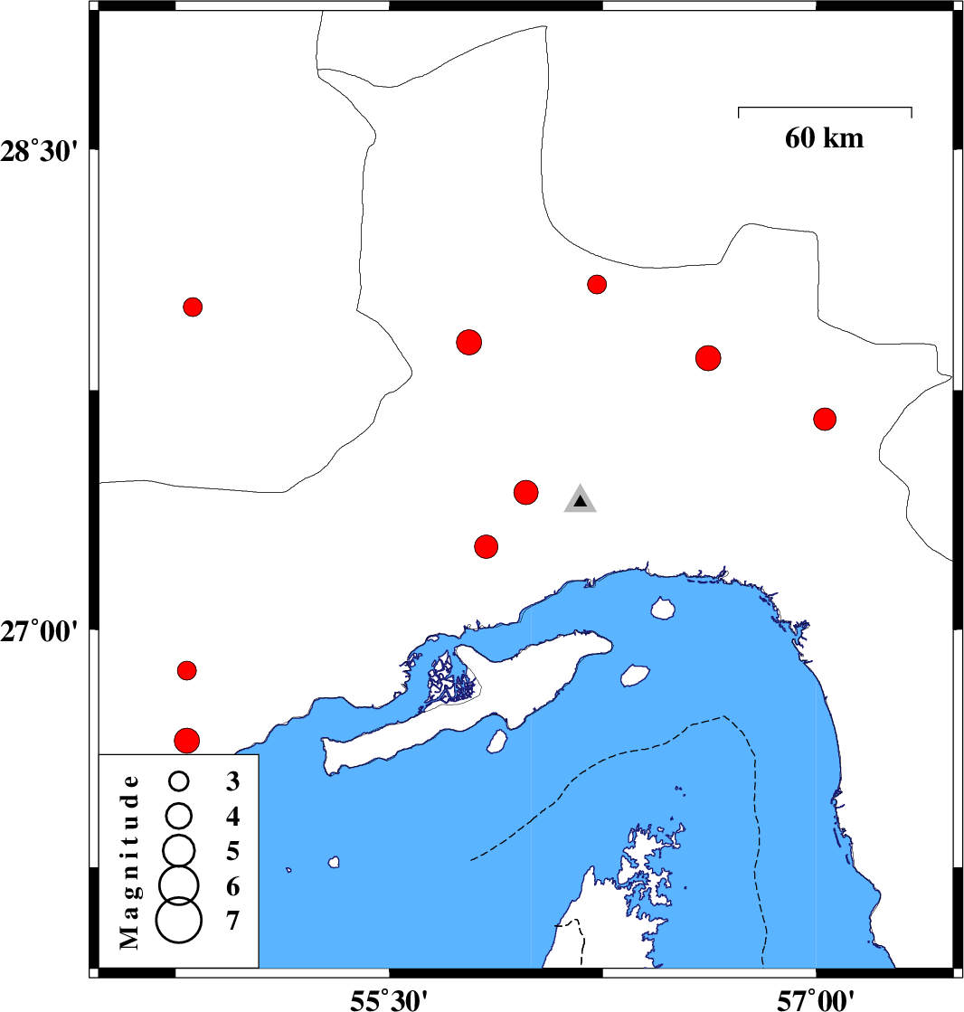 2008/08/04 | 09:08:45.7 | 13:38:45.7 | 26.65 | 54.79 | 15 | ML3.9 | 14 km North of Bandar-e lengeh, Hormozgan Province | ||