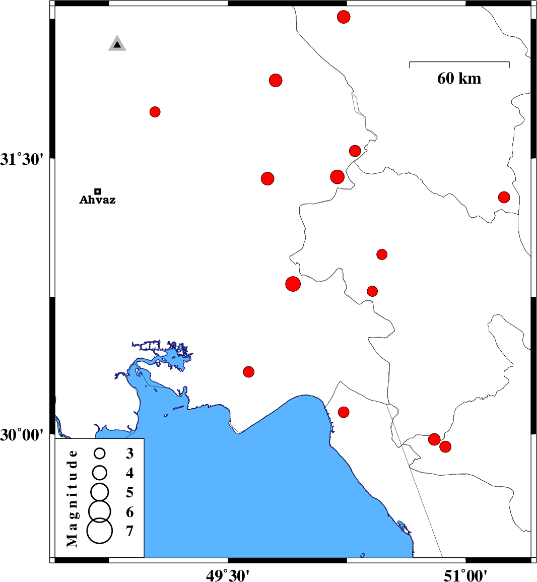 | 2008/07/28 | 09:01:44.4 | 13:31:44.4 | 30.34 | 49.63 | 16 | ML3.1 | 13 km Hendijan, Khoozestan Province |