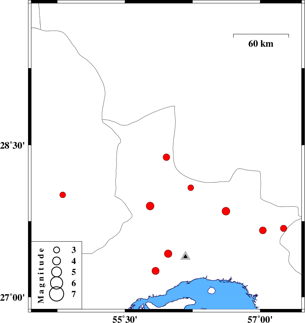 2008/08/03 | 00:44:38.4 | 05:14:38.4 | 27.66 | 57.03 | 15 | ML3.5 | 33 km North-West of Dehbarez, Hormozgan Province | ||