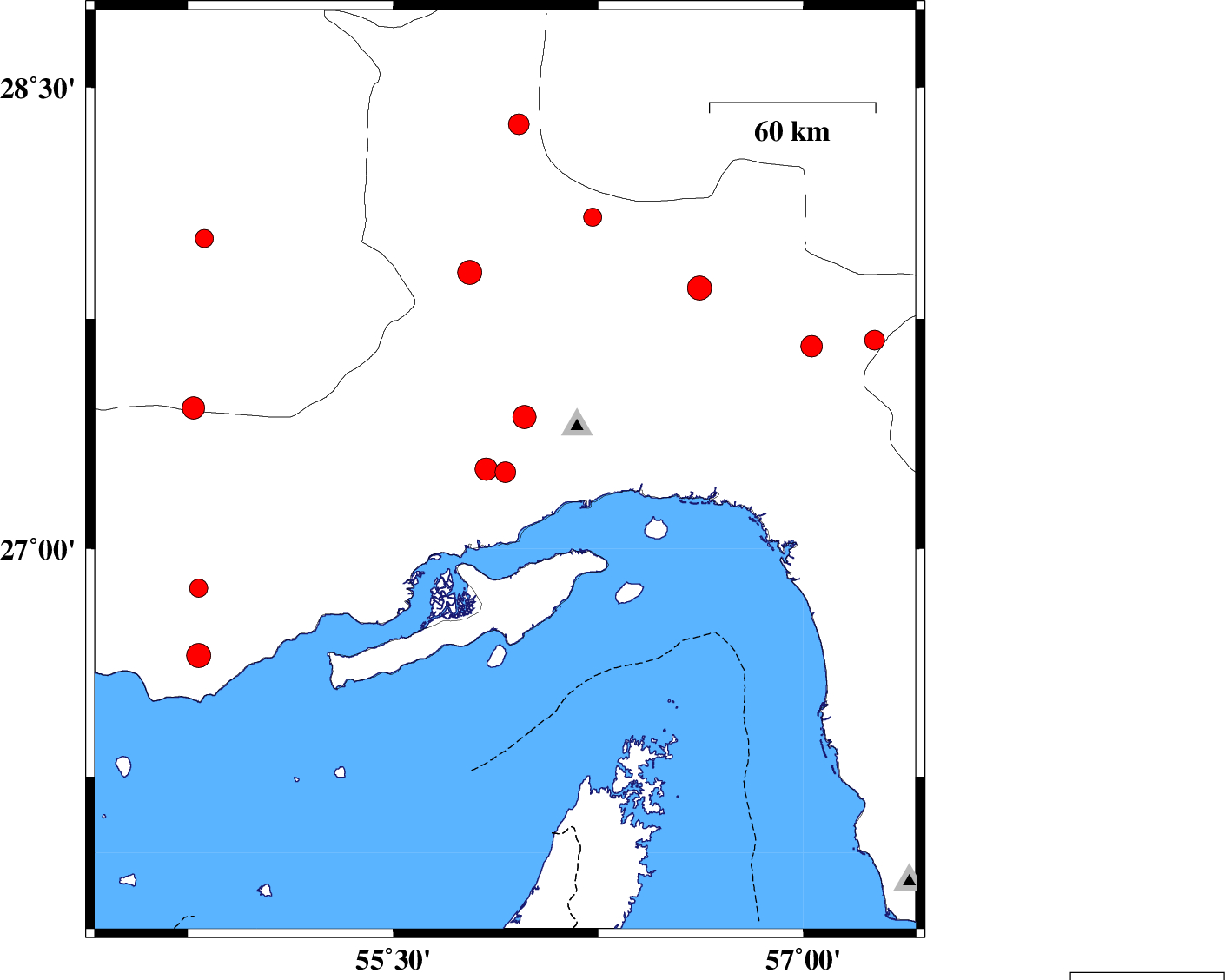 2008/08/27 | 20:20:18.8 | 00:50:18.8 | 27.25 | 55.91 | 5 | ML3.4 | 37 km West of Bandar-e abbas, Hormozgan Province | ||