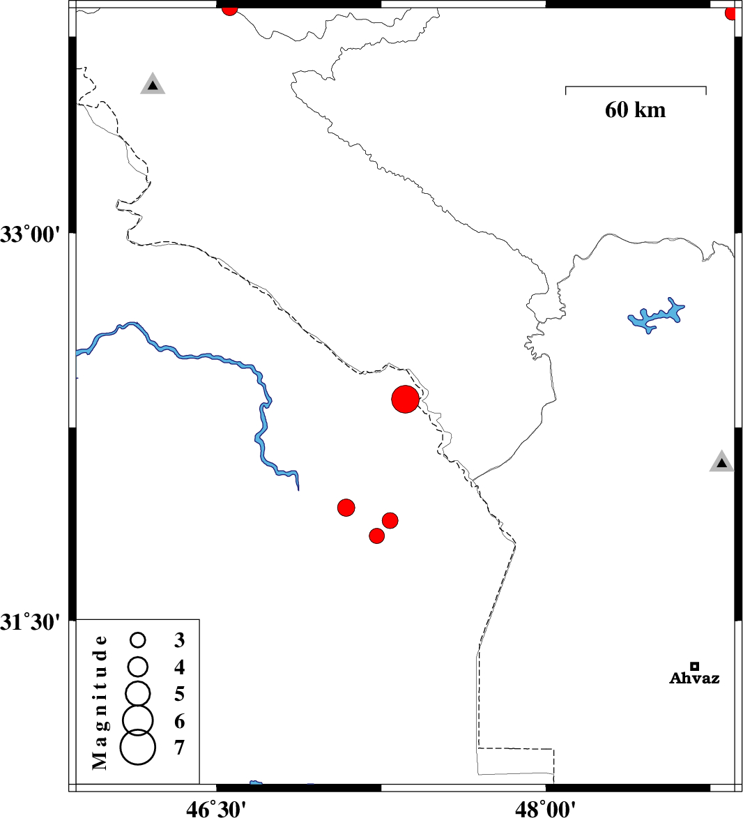 2008/08/27 | 21:52:39.9 | 02:22:39.9 | 32.36 | 47.36 | 33 | ML5.6 | 38 km South of Dehloran, Ilam Province | ||