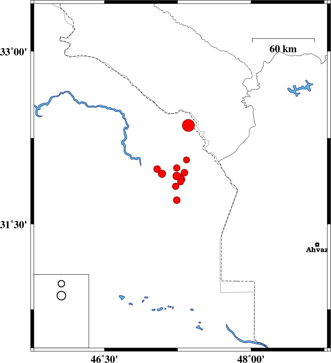 2008/08/28 | 05:44:47.6 | 10:14:47.6 | 31.95 | 47.32 | 41 | ML3.3 | 82 km South of Dehloran, Ilam Province | ||