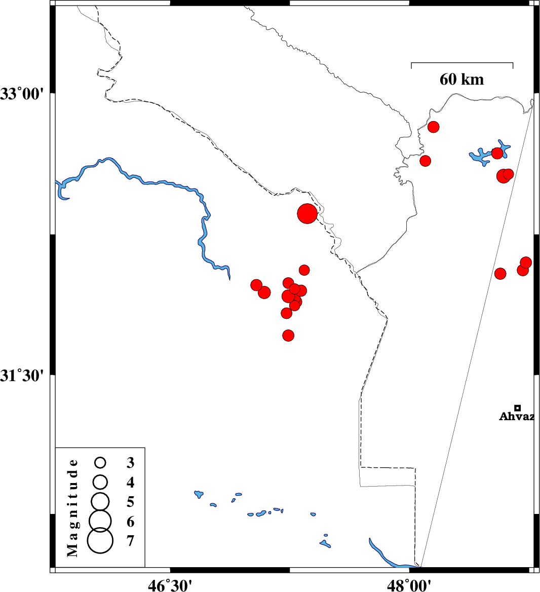 | 2008/08/28 | 02:43:57.5 | 07:13:57.5 | 31.87 | 47.28 | 37 | ML3 | 91 km South of Dehloran, Ilam Province | ||