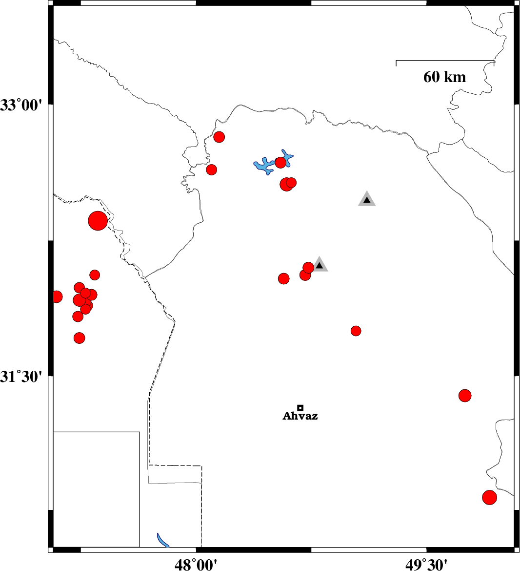 | 2008/08/27 | 23:16:17.9 | 03:46:17.9 | 31.83 | 47.23 | 37 | ML3.1 | 95 km North-West of Susangerd, Khoozestan Province | ||