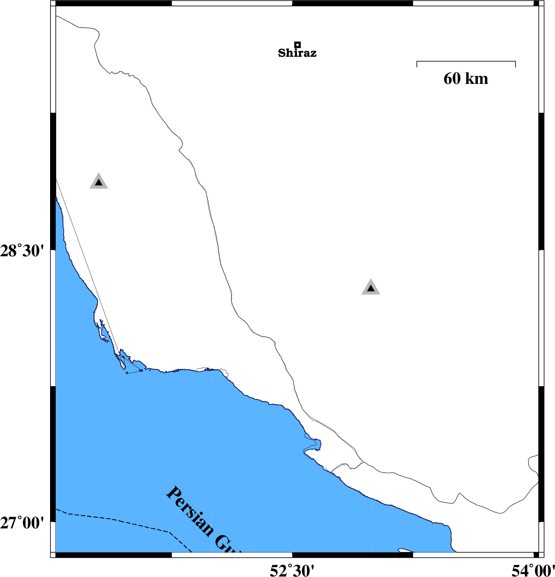 | 2008/09/01 | 08:08:54.1 | 12:38:54.1 | 28.33 | 52.53 | 3 | ML3.4 | 51 km South-West of Qir va Karzin, Fars Province |