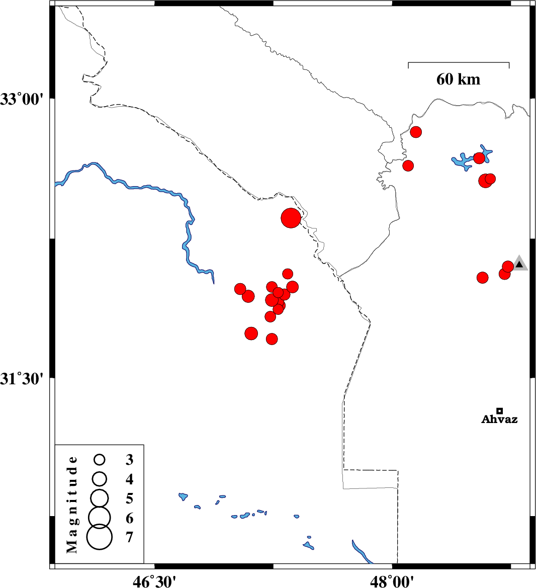 | 2008/08/31 | 19:48:44.1 | 00:18:44.1 | 32.04 | 48.57 | 14 | ML3.2 | 26 km West of Shushtar, Khoozestan Province | ||