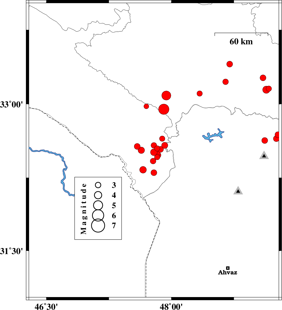 2008/09/03 | 22:43:15.4 | 03:13:15.4 | 32.5 | 47.39 | 14 | ML4.9 | 24 km South-East of Dehloran, Ilam Province | ||