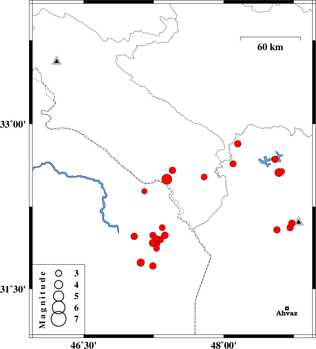| 2008/08/28 | 02:43:57.5 | 07:13:57.5 | 31.87 | 47.28 | 37 | ML3 | 91 km South of Dehloran, Ilam Province | ||
