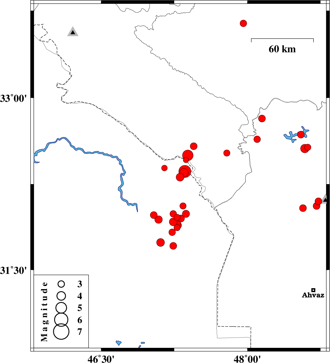 | 2008/08/28 | 02:43:57.5 | 07:13:57.5 | 31.87 | 47.28 | 37 | ML3 | 91 km South of Dehloran, Ilam Province | ||