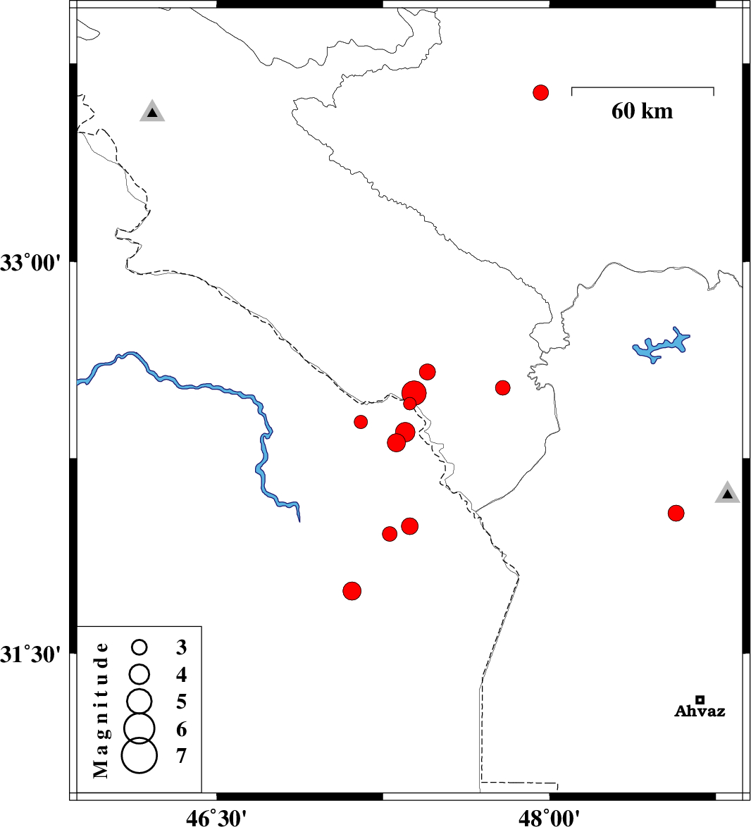 | 2008/09/03 | 22:54:45.1 | 03:24:45.1 | 32.52 | 47.79 | 30 | ML3 | 52 km South-East of Dehloran, Ilam Province | ||