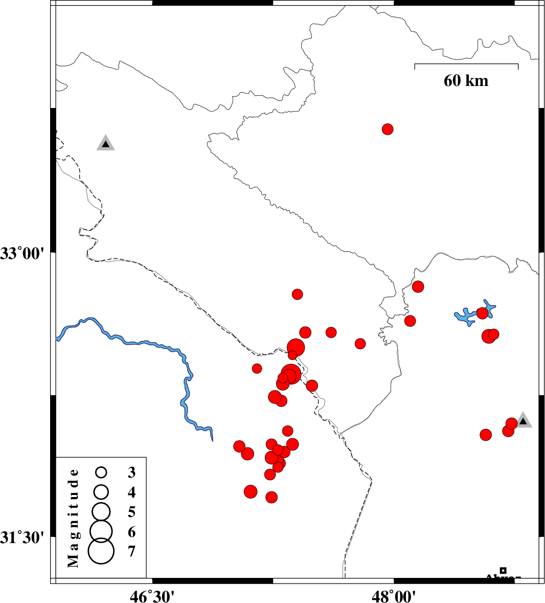 | 2008/08/28 | 02:43:57.5 | 07:13:57.5 | 31.87 | 47.28 | 37 | ML3 | 91 km South of Dehloran, Ilam Province | ||