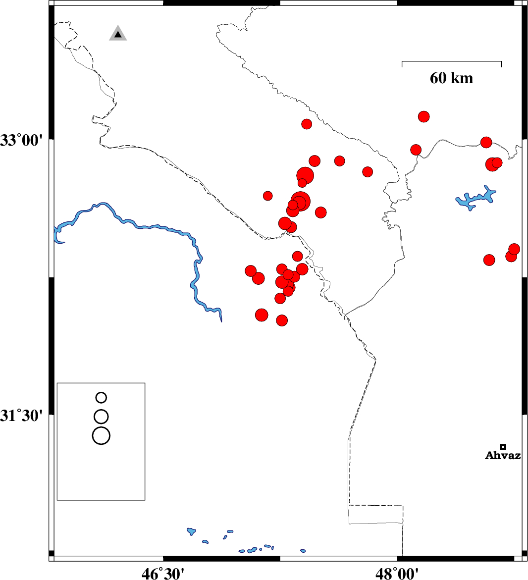 2008/08/28 | 05:44:47.6 | 10:14:47.6 | 31.95 | 47.32 | 41 | ML3.3 | 82 km South of Dehloran, Ilam Province | ||