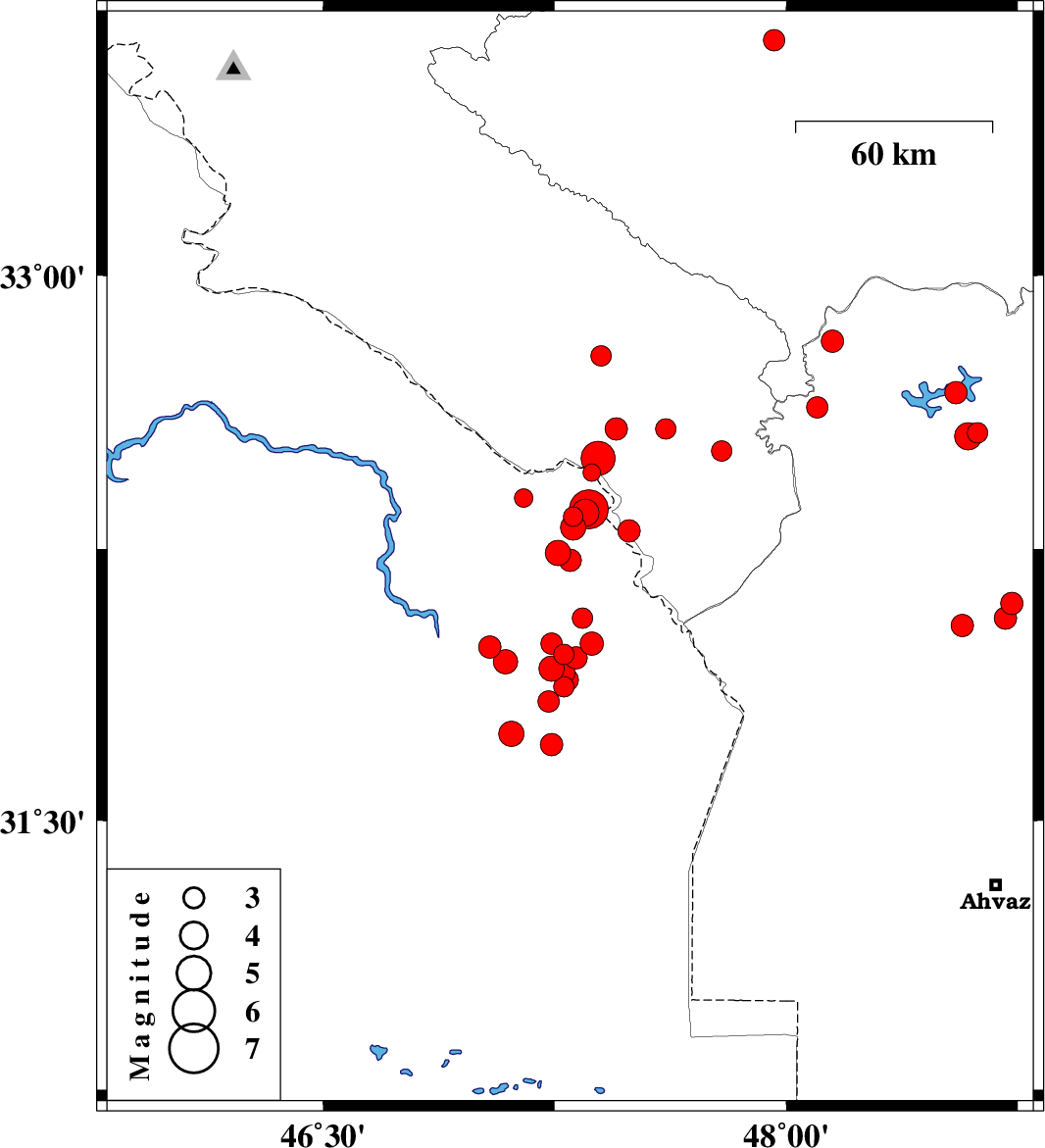| 2008/08/28 | 02:43:57.5 | 07:13:57.5 | 31.87 | 47.28 | 37 | ML3 | 91 km South of Dehloran, Ilam Province | ||