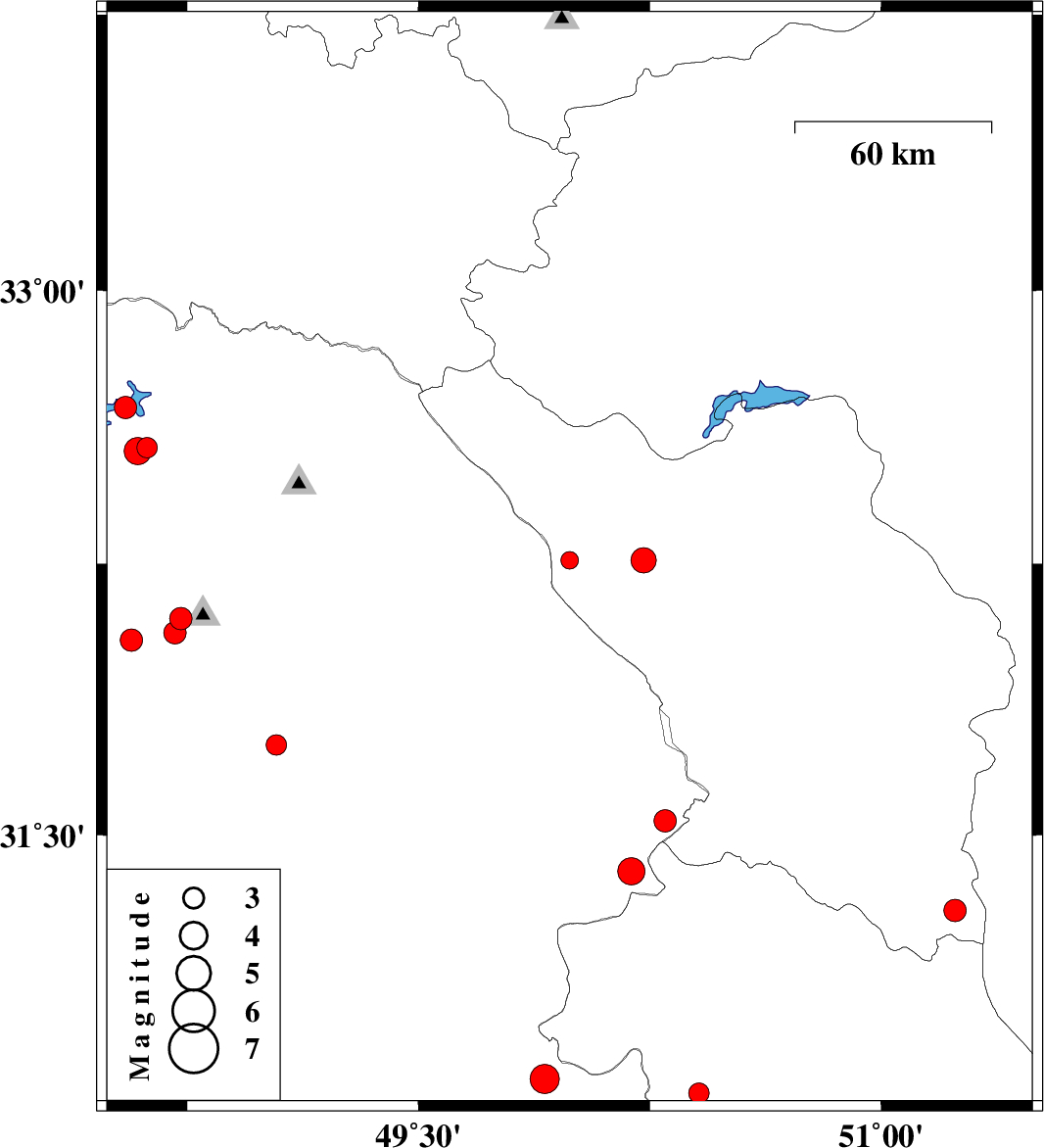 | 2008/08/16 | 02:03:14.5 | 06:33:14.5 | 32.26 | 50.23 | 15 | ML3.7 | 25 km South-East of Chelgard, Chaharmahal Bakhtiari Province | ||