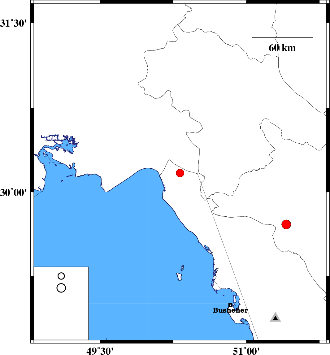 | 2008/09/05 | 03:11:42.5 | 07:41:42.5 | 29.71 | 51.41 | 15 | ML4.2 | 25 km West of Kazerun, Fars Province |