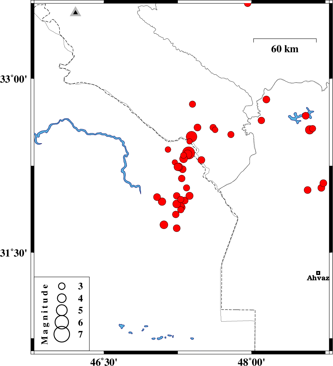 | 2008/08/28 | 02:43:57.5 | 07:13:57.5 | 31.87 | 47.28 | 37 | ML3 | 91 km South of Dehloran, Ilam Province | ||
