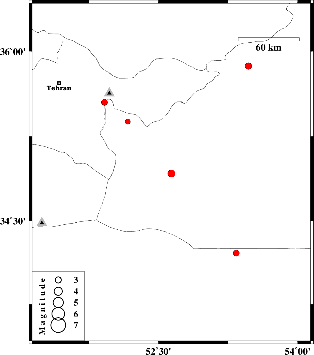 2008/09/15 | 22:27:01.2 | 02:57:01.2 | 34.92 | 52.64 | 15 | ML3.5 | 42 km South-East of Garmsar, Semnan Province | ||