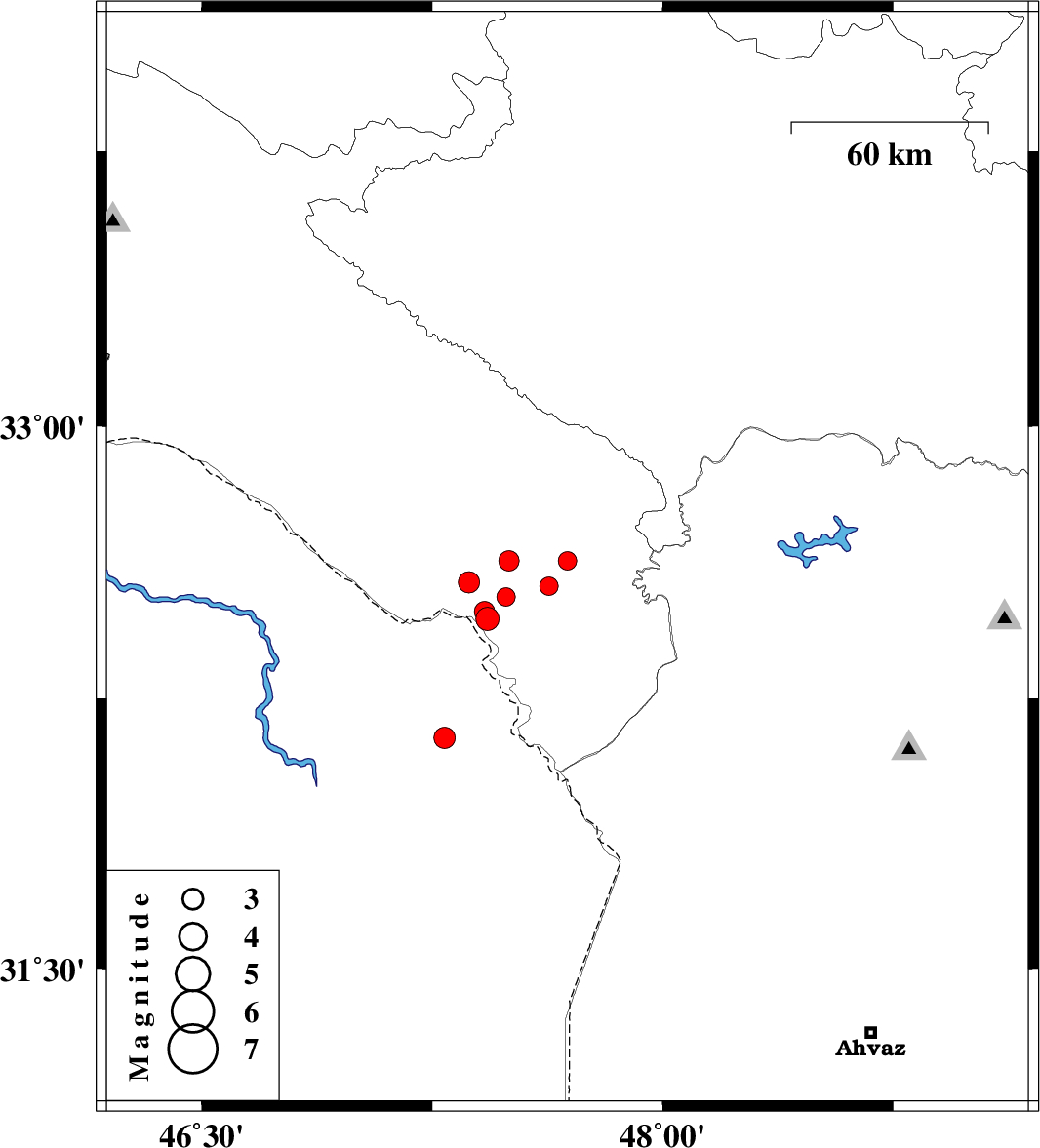 | 2008/09/13 | 02:00:58.5 | 06:30:58.5 | 32.56 | 47.63 | 14 | ML2.7 | 37 km South-East of Dehloran, Ilam Province |