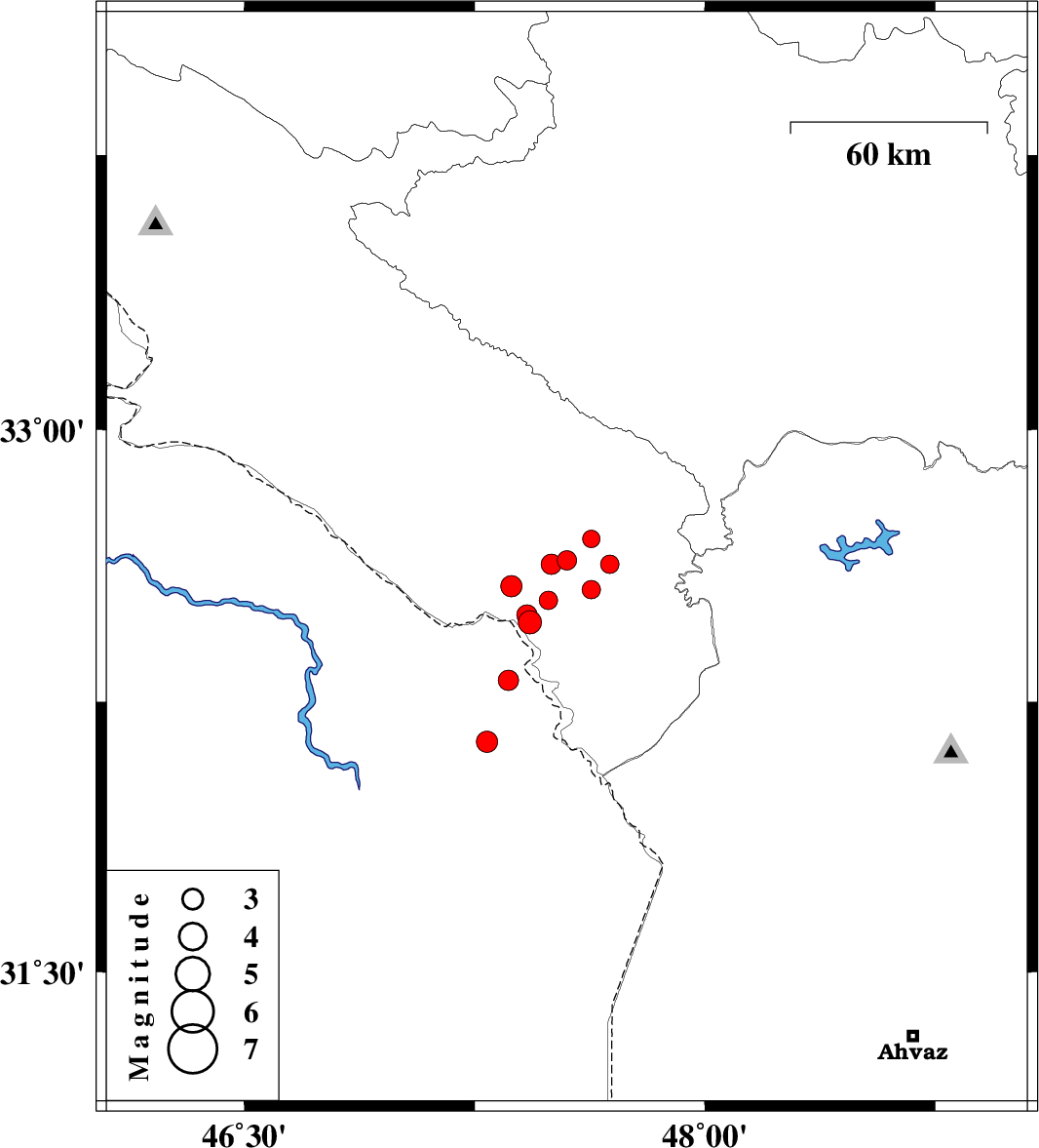 | 2008/09/13 | 02:00:58.5 | 06:30:58.5 | 32.56 | 47.63 | 14 | ML2.7 | 37 km South-East of Dehloran, Ilam Province |