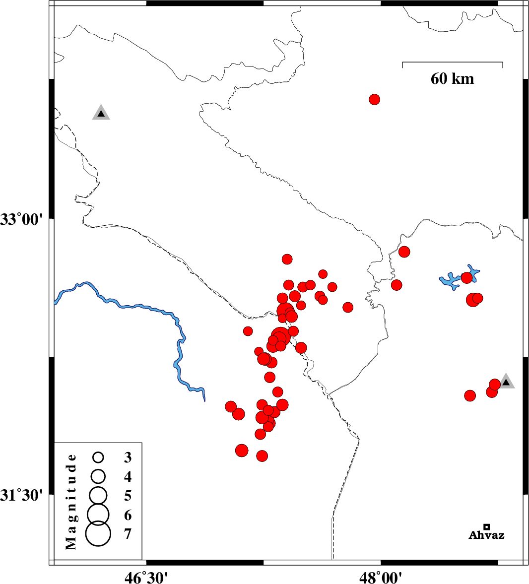 | 2008/08/28 | 02:43:57.5 | 07:13:57.5 | 31.87 | 47.28 | 37 | ML3 | 91 km South of Dehloran, Ilam Province | ||