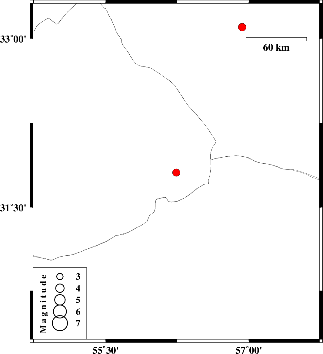2008/09/20 | 07:02:27.7 | 11:32:27.7 | 31.81 | 56.24 | 15 | ML3.5 | 81 km North-West of Ravar, Kerman Province | ||