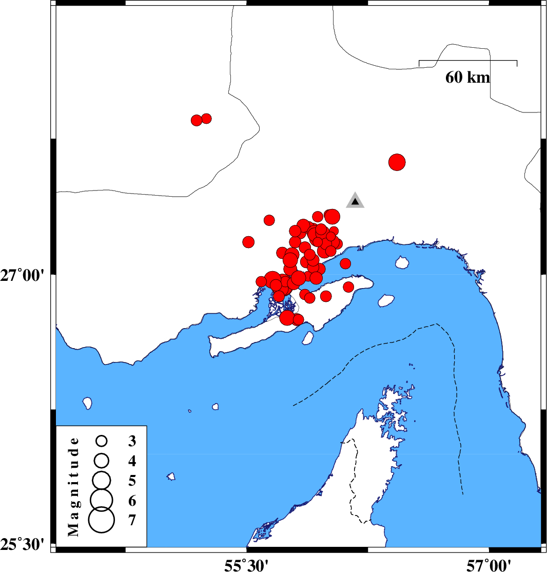 2008/09/12 | 02:20:33.2 | 06:50:33.2 | 26.75 | 55.82 | 6 | ML2.9 | Persian Gulf, 50 km South-West of Qeshm | ||