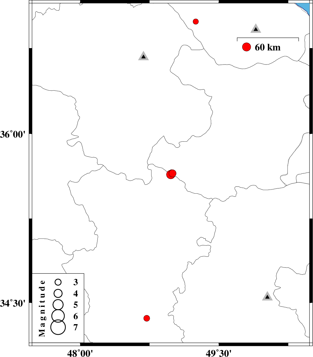 2008/09/13 | 19:24:12.0 | 23:54:12.0 | 36.76 | 49.8 | 28 | ML4.1 | 34 km East of Rudbar, Gilan Province | ||