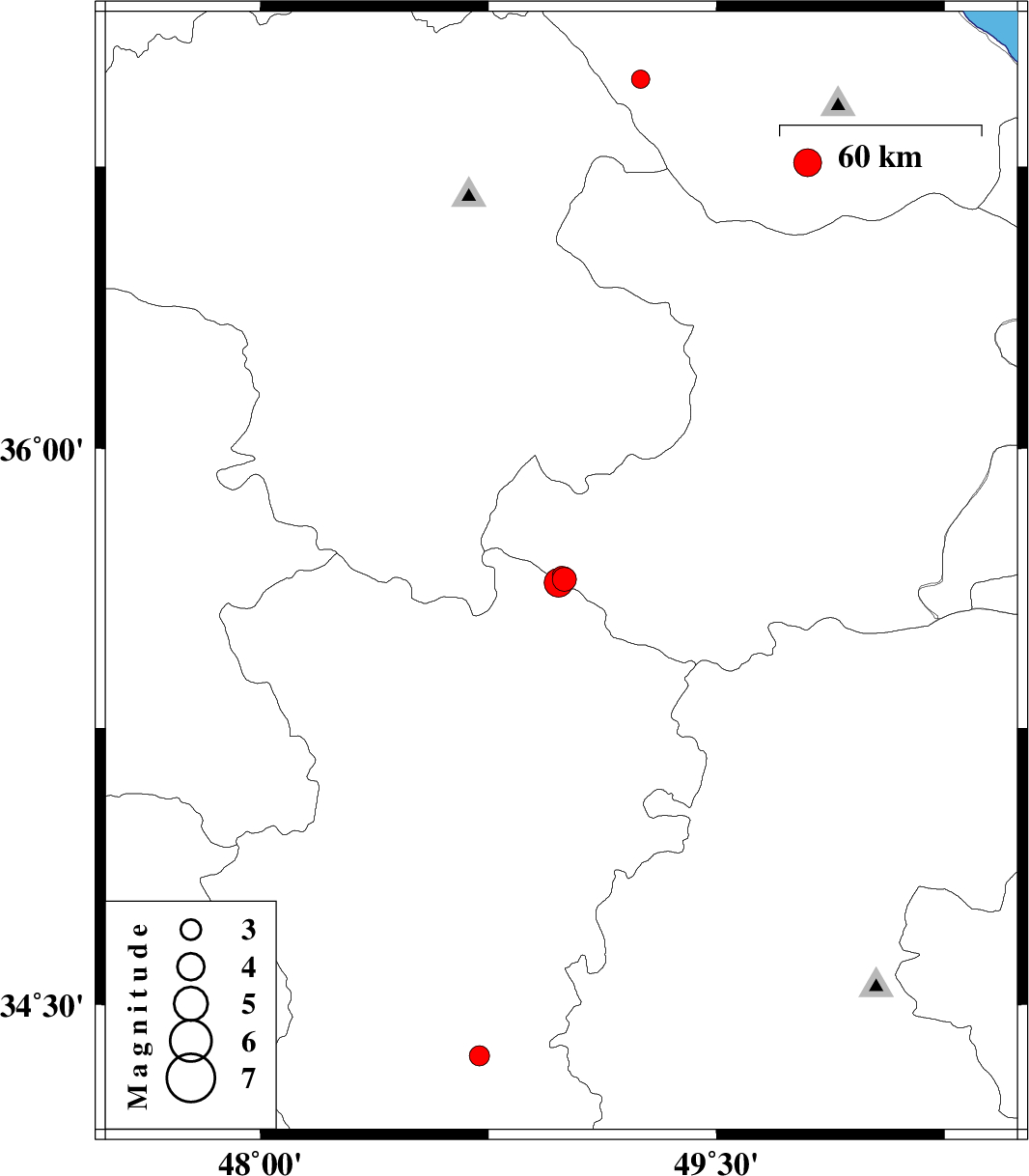2008/09/13 | 19:24:12.0 | 23:54:12.0 | 36.76 | 49.8 | 28 | ML4.1 | 34 km East of Rudbar, Gilan Province | ||