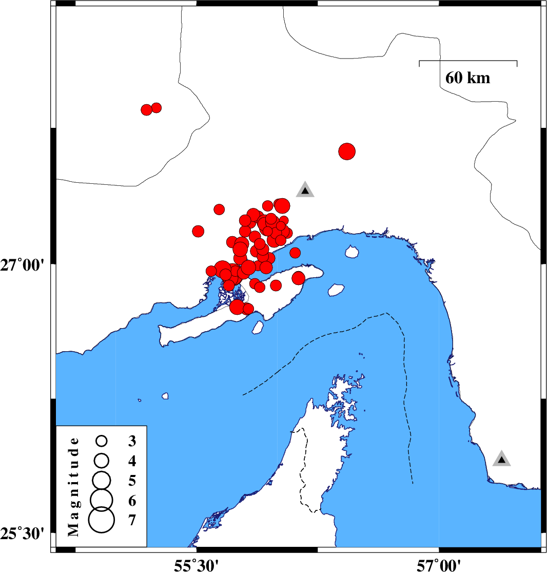 2008/09/12 | 02:20:33.2 | 06:50:33.2 | 26.75 | 55.82 | 6 | ML2.9 | Persian Gulf, 50 km South-West of Qeshm | ||
