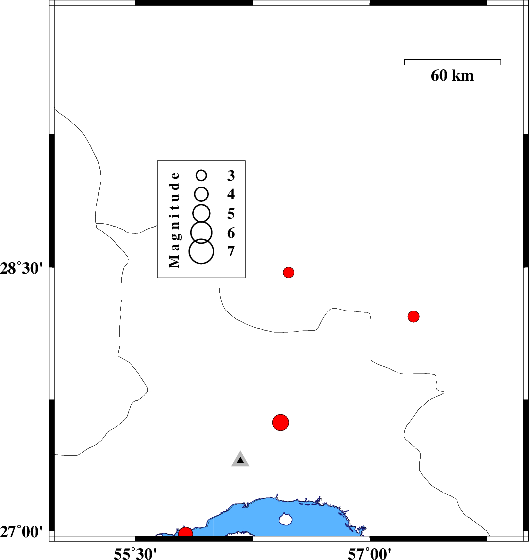 2008/09/26 | 03:36:32.3 | 07:06:32.3 | 26.98 | 55.82 | 6 | ML4.1 | Persian Gulf, 44 km West of Qeshm |
