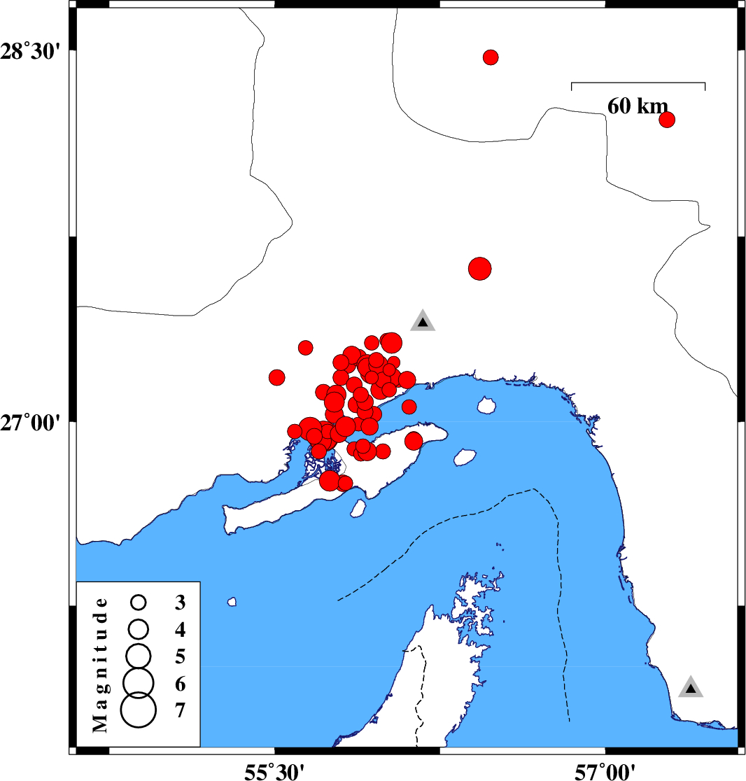 2008/09/12 | 02:20:33.2 | 06:50:33.2 | 26.75 | 55.82 | 6 | ML2.9 | Persian Gulf, 50 km South-West of Qeshm | ||