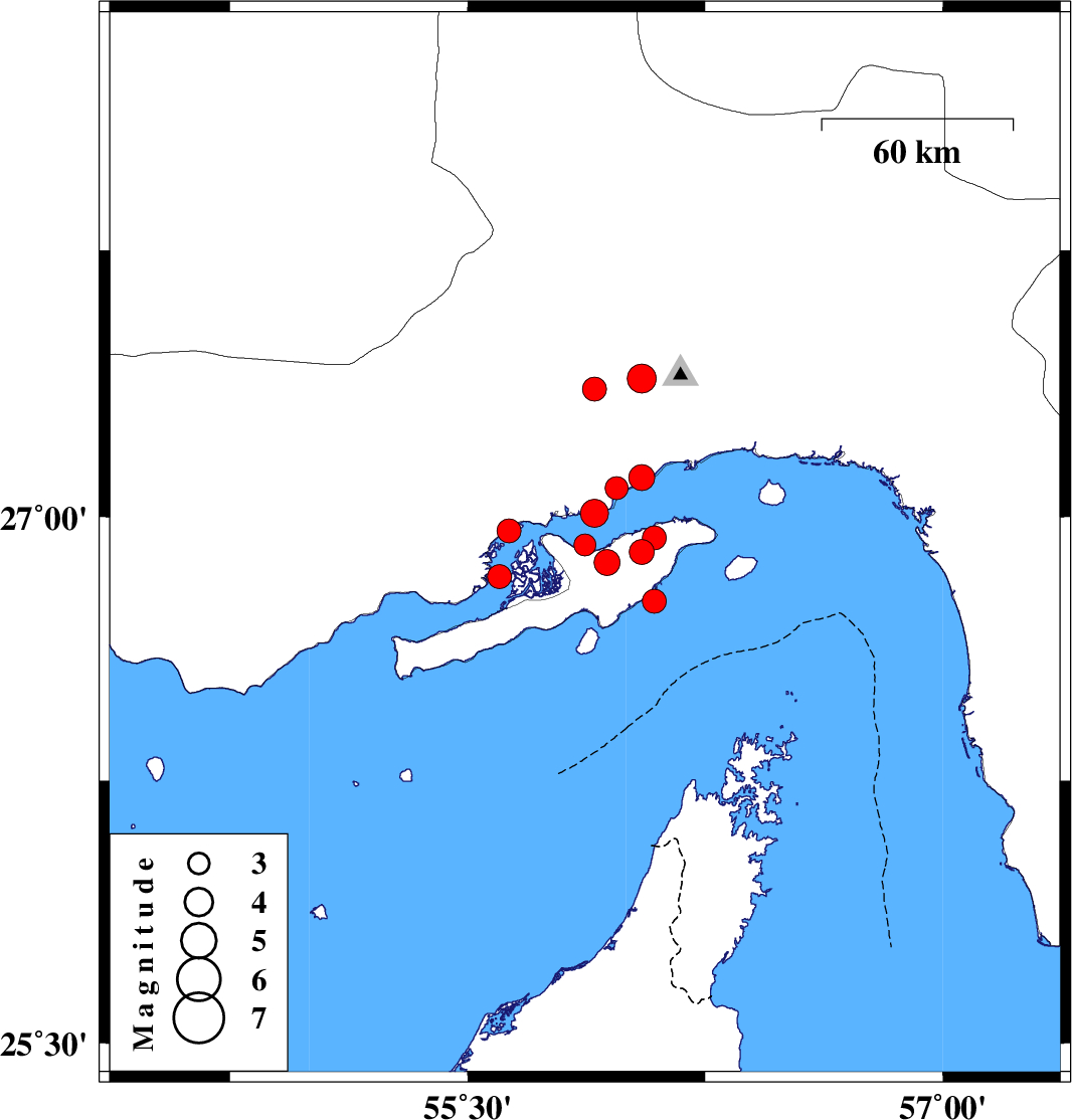 2008/10/10 | 19:41:01.9 | 23:11:01.9 | 26.92 | 55.87 | 27 | ML3.1 | Persian Gulf, 40 km West of Qeshm | ||