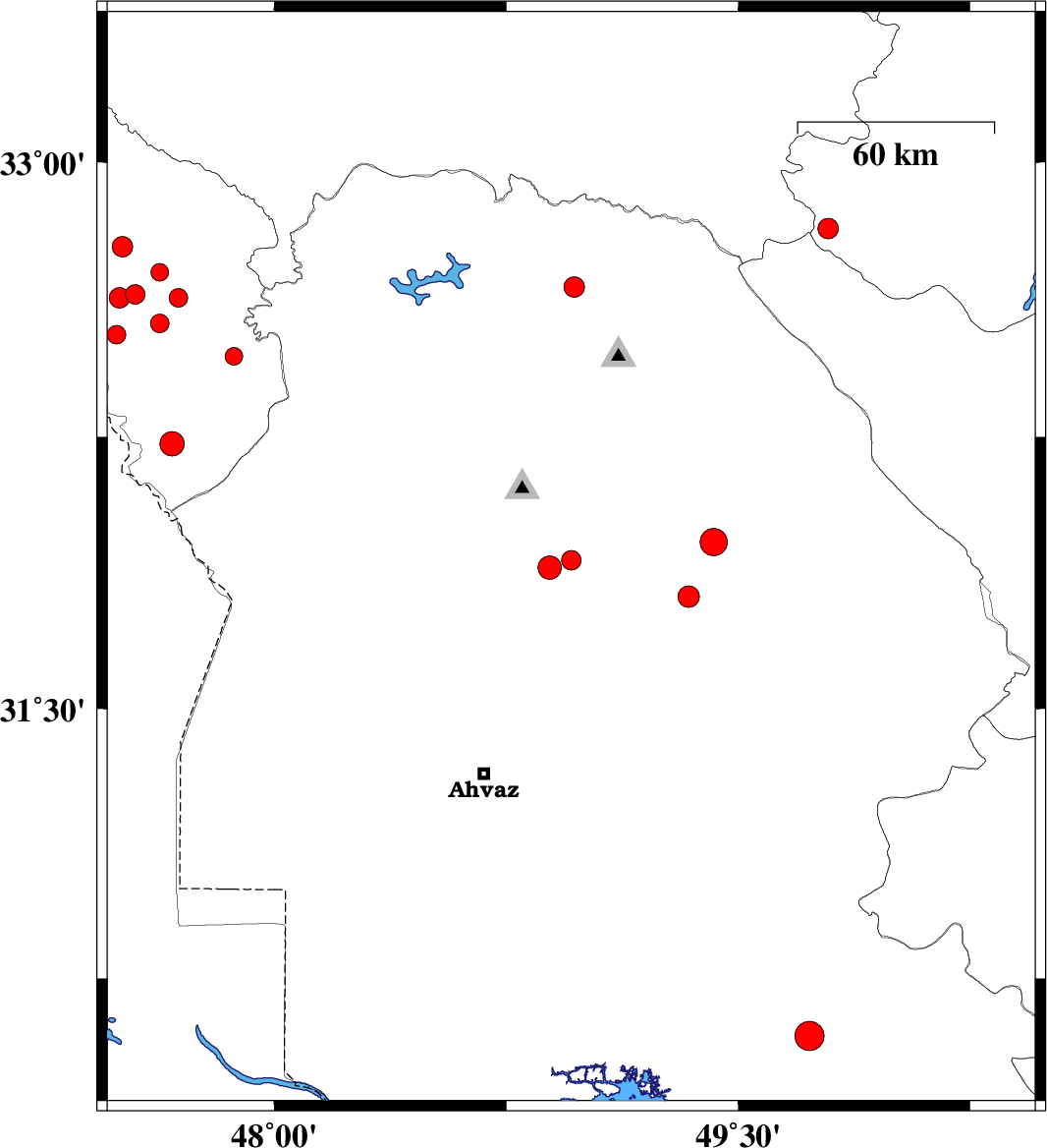 2008/10/12 | 23:15:26.3 | 02:45:26.3 | 31.91 | 48.96 | 8 | ML2.8 | 17 km South-East of Shushtar, Khoozestan Province | ||