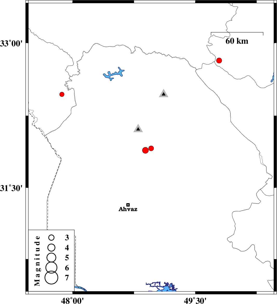 | 2008/10/12 | 23:11:16.9 | 02:41:16.9 | 31.89 | 48.89 | 10 | ML3.4 | 17 km South of Shushtar, Khoozestan Province | ||