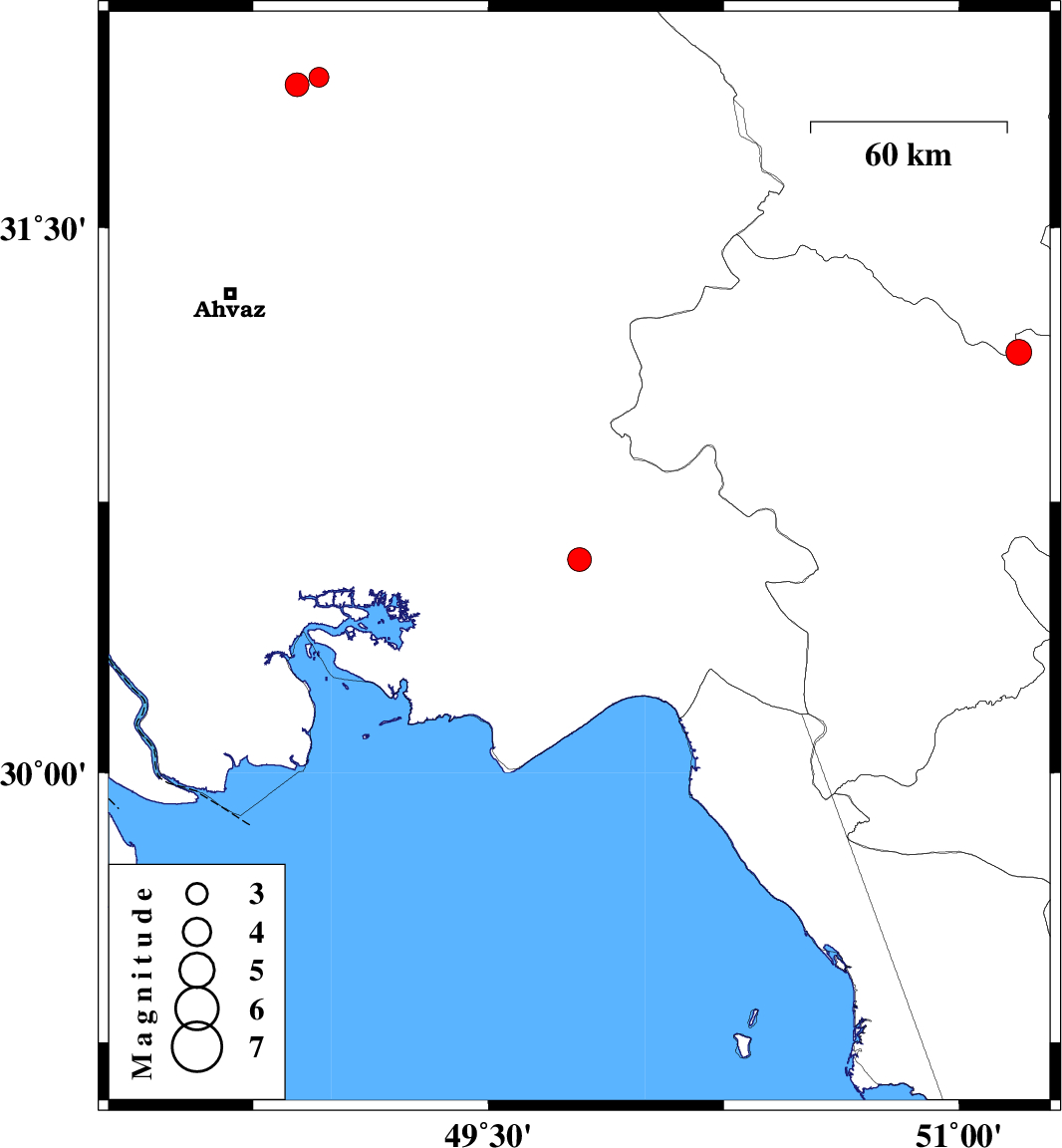 | 2008/10/16 | 13:21:08.2 | 16:51:08.2 | 30.59 | 49.79 | 18 | ML3.4 | 20 km South of Omidiyeh, Khoozestan Province | ||