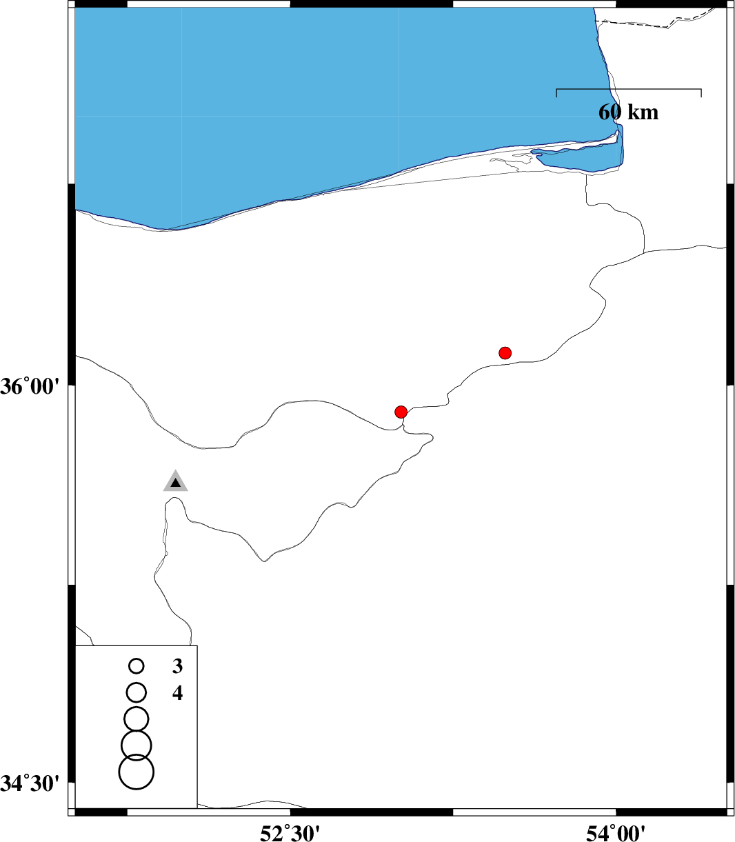2008/10/10 | 01:56:25.0 | 05:26:25.0 | 36.12 | 53.49 | 14 | ML2.6 | 38 km East of Pol-E-Sefid, Mazandaran Province |