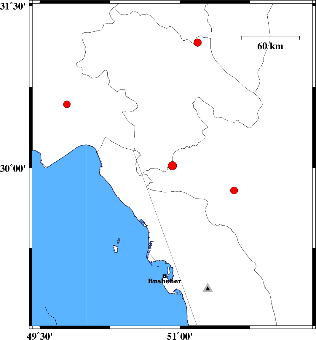 | 2008/10/16 | 13:21:08.2 | 16:51:08.2 | 30.59 | 49.79 | 18 | ML3.4 | 20 km South of Omidiyeh, Khoozestan Province | ||