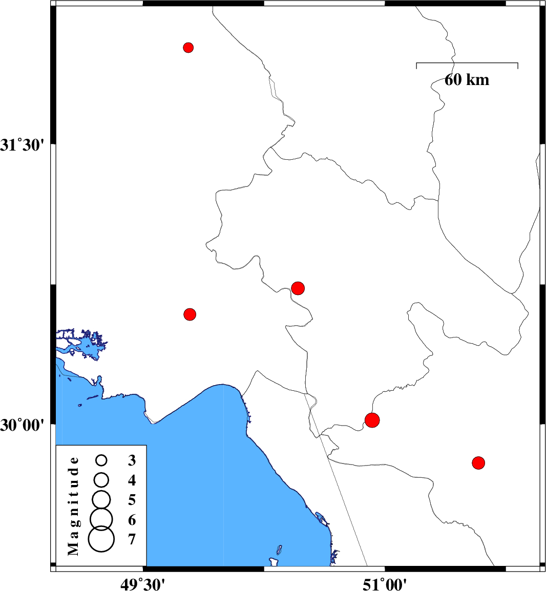 | 2008/10/16 | 13:21:08.2 | 16:51:08.2 | 30.59 | 49.79 | 18 | ML3.4 | 20 km South of Omidiyeh, Khoozestan Province | ||
