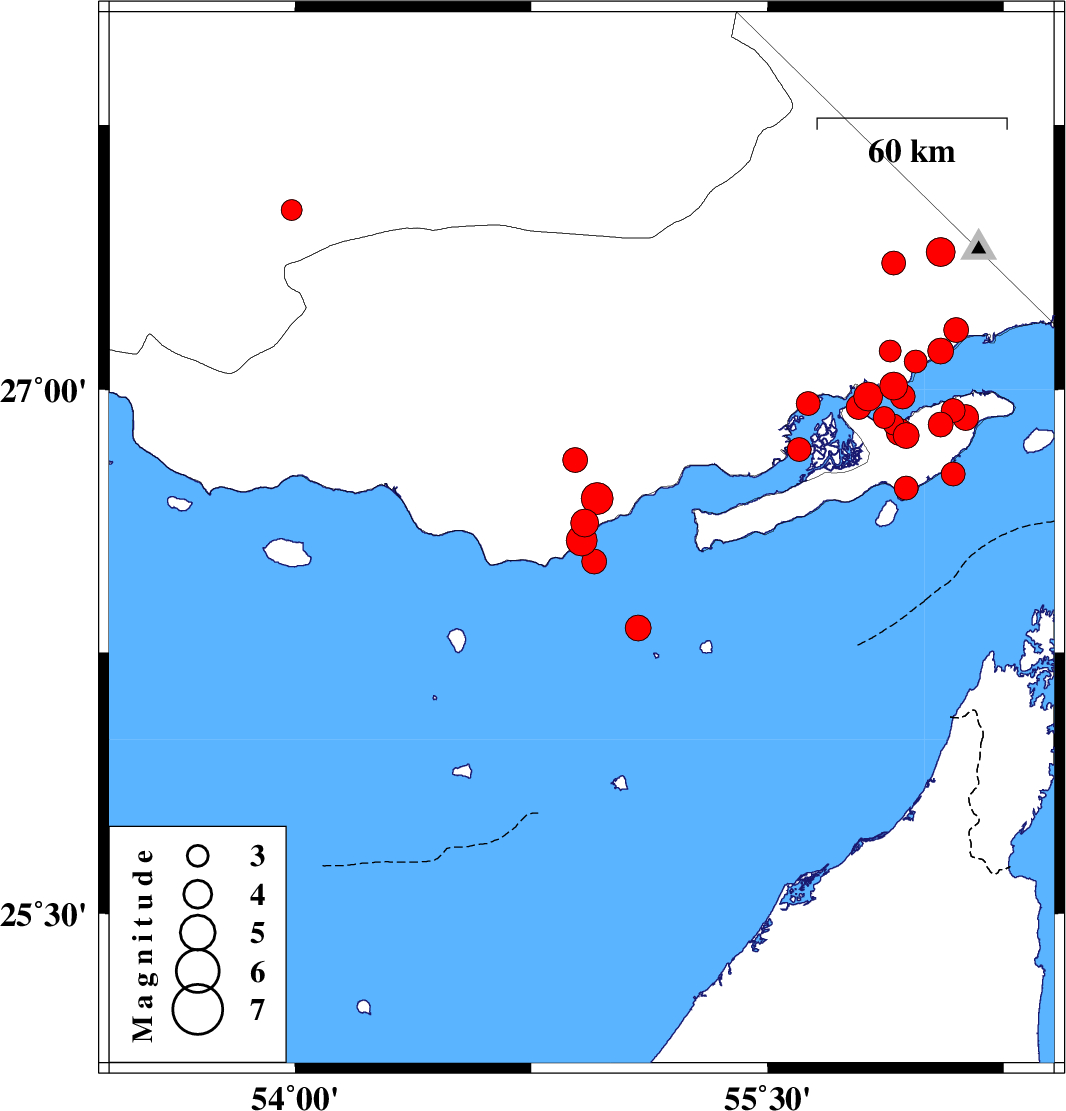 2008/09/29 | 04:30:20.5 | 08:00:20.5 | 26.9 | 55.9 | 7 | ML2.9 | Persian Gulf, 36 km West of Qeshm | ||