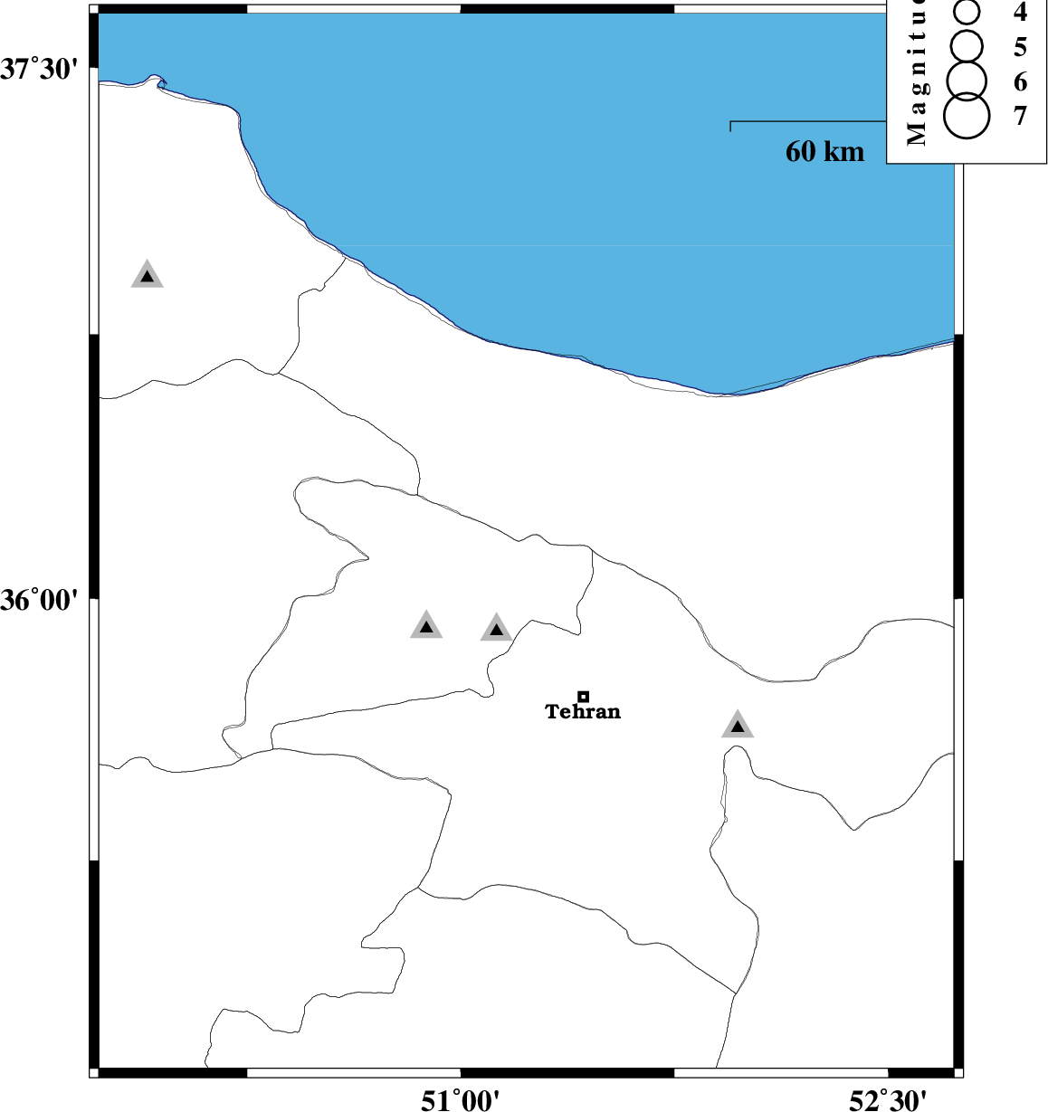 2008/10/21 | 22:23:05.7 | 01:53:05.7 | 36.15 | 51.23 | 12 | ML3 | 43 km North-West of Tajrish, Tehran Province | ||