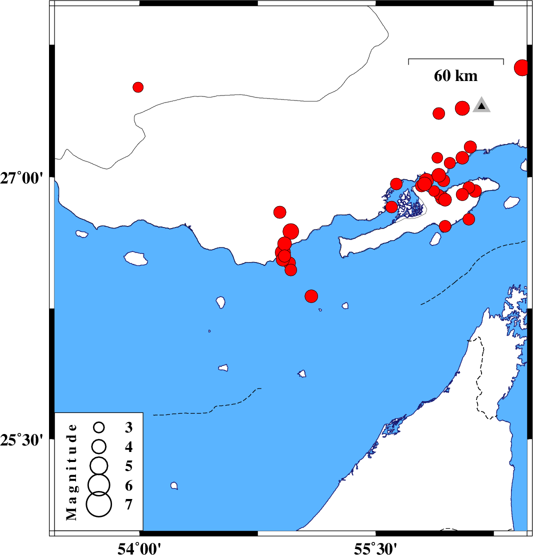 2008/09/22 | 04:39:40.9 | 08:09:40.9 | 26.98 | 55.93 | 10 | ML3.5 | Persian Gulf, 33 km West of Qeshm |