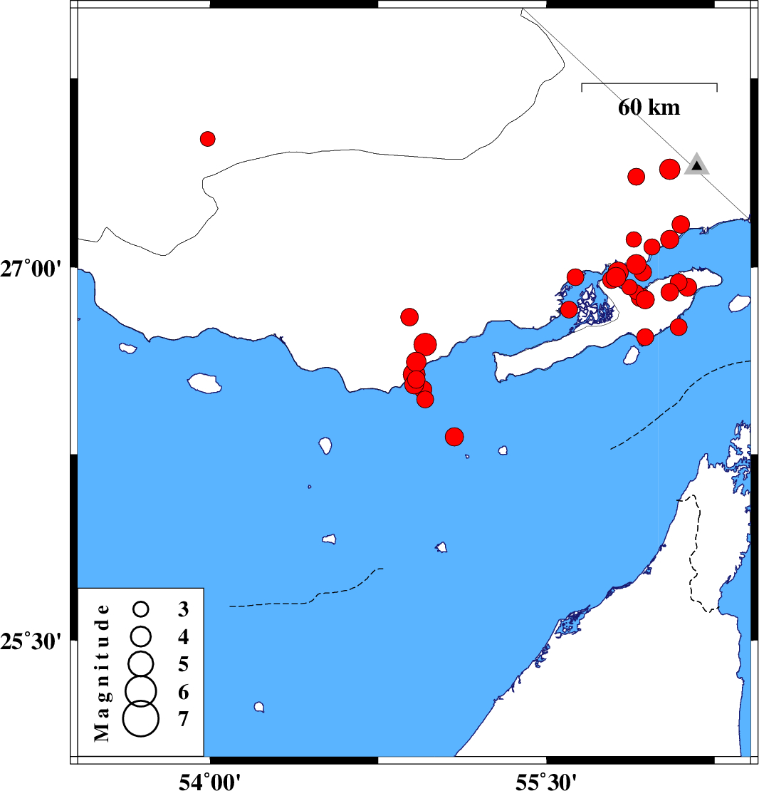 2008/09/26 | 03:36:32.3 | 07:06:32.3 | 26.98 | 55.82 | 6 | ML4.1 | Persian Gulf, 44 km West of Qeshm | ||