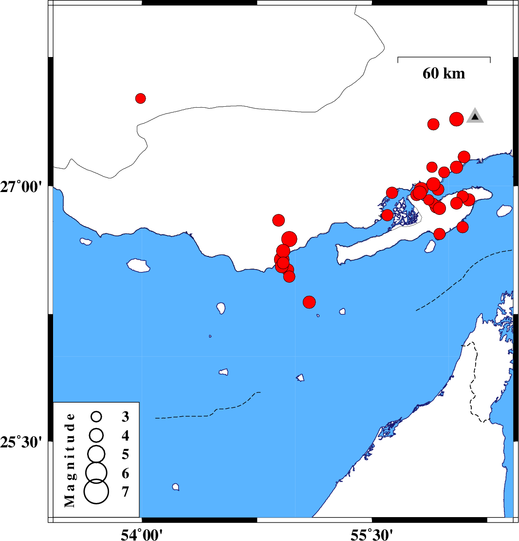 2008/09/26 | 03:36:32.3 | 07:06:32.3 | 26.98 | 55.82 | 6 | ML4.1 | Persian Gulf, 44 km West of Qeshm | ||