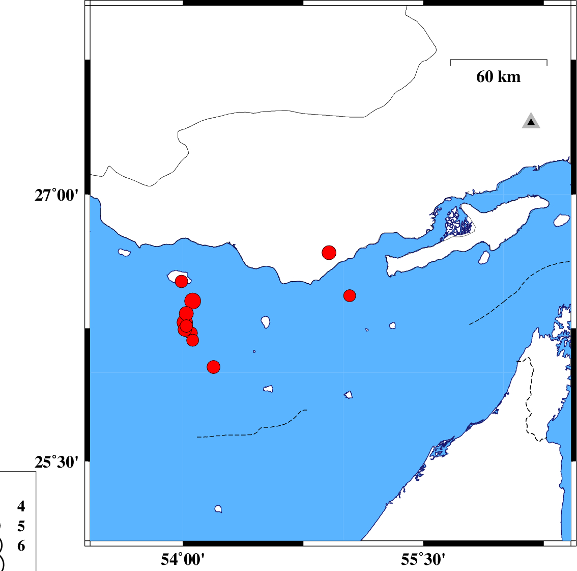 2008/10/22 09:12:12.6 12:42:12.6 26.9655.817 ML3.9 Persian Gulf, 45 km West of Qeshm