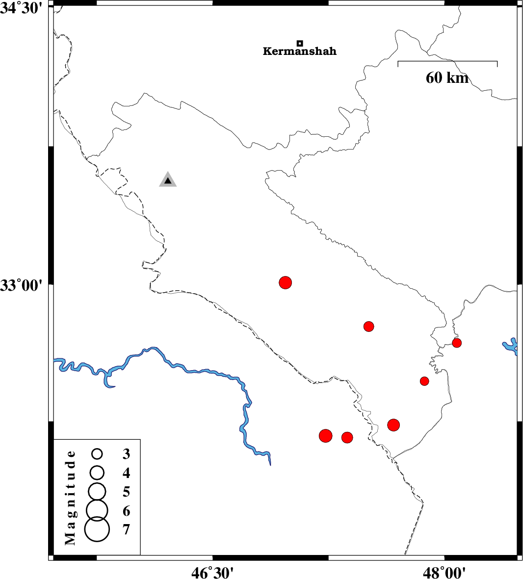 2008/10/23 | 12:00:22.1 | 15:30:22.1 | 33.01 | 46.97 | 14 | ML3.7 | 34 km South-West of Darreh Shahr, Ilam Province | ||