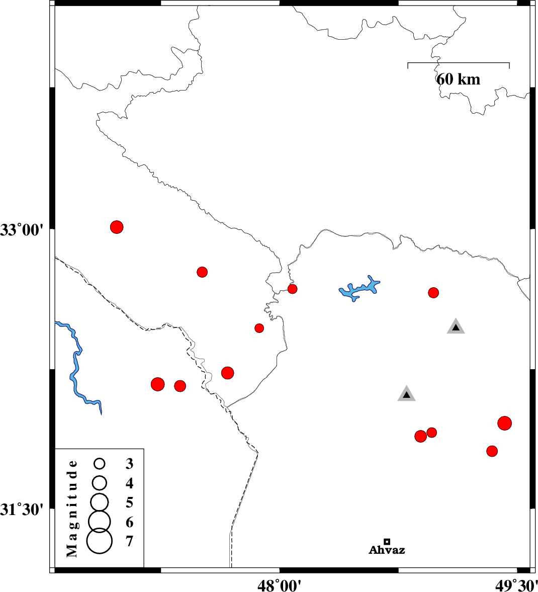 | 2008/09/23 | 13:58:40.0 | 17:28:40.0 | 32.77 | 47.51 | 15 | ML3 | 18 km South of Abdanan, Ilam Province |