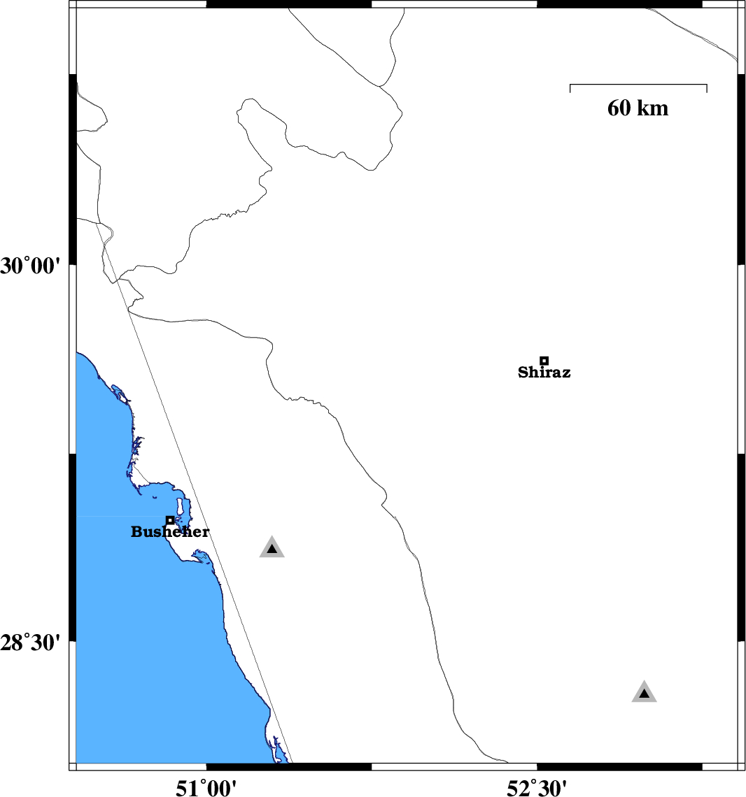 2008/10/24 | 05:22:57.9 | 08:52:57.9 | 29.51 | 51.91 | 16 | ML4.2 | 28 km South-East of Kazerun, Fars Province | ||